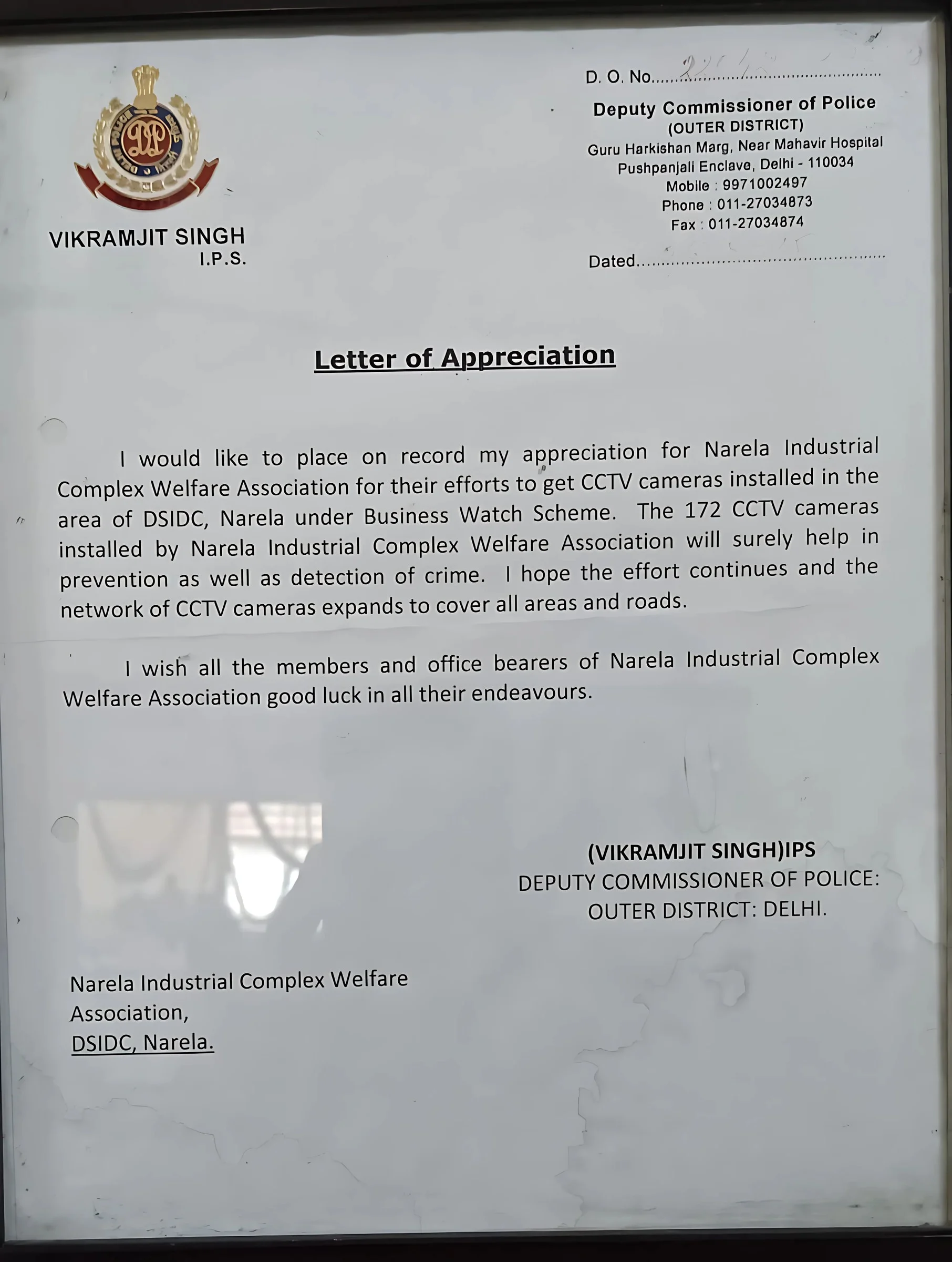 Sh. Vikramjit Singh, IPS, DCP Outer, presented a recognition award to the Narela Industrial Complex Welfare Association for their proactive efforts in fostering security and community well-being. This partnership between law enforcement and local stakeholders exemplifies the power of collaboration in creating secure industrial and residential spaces.